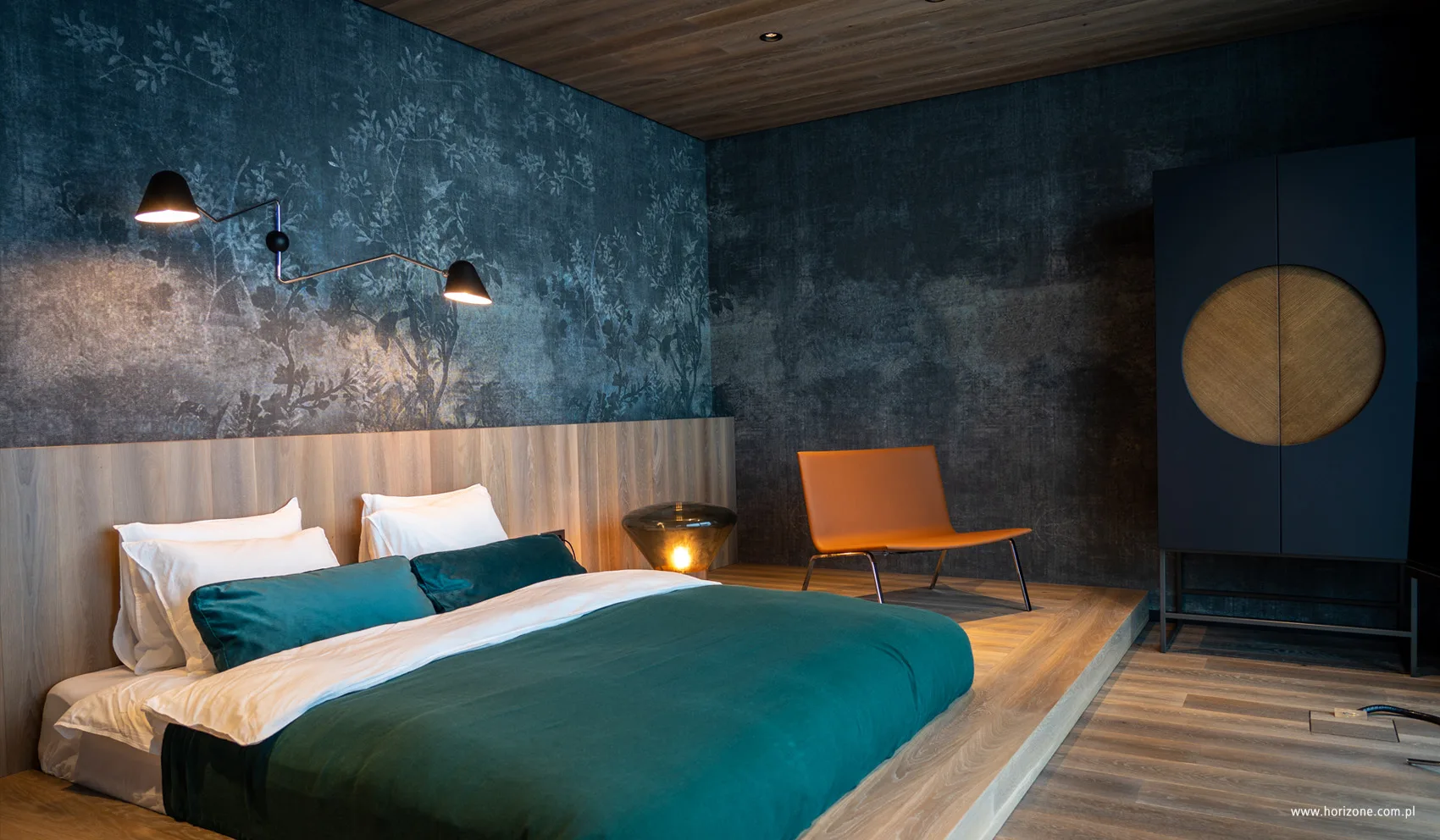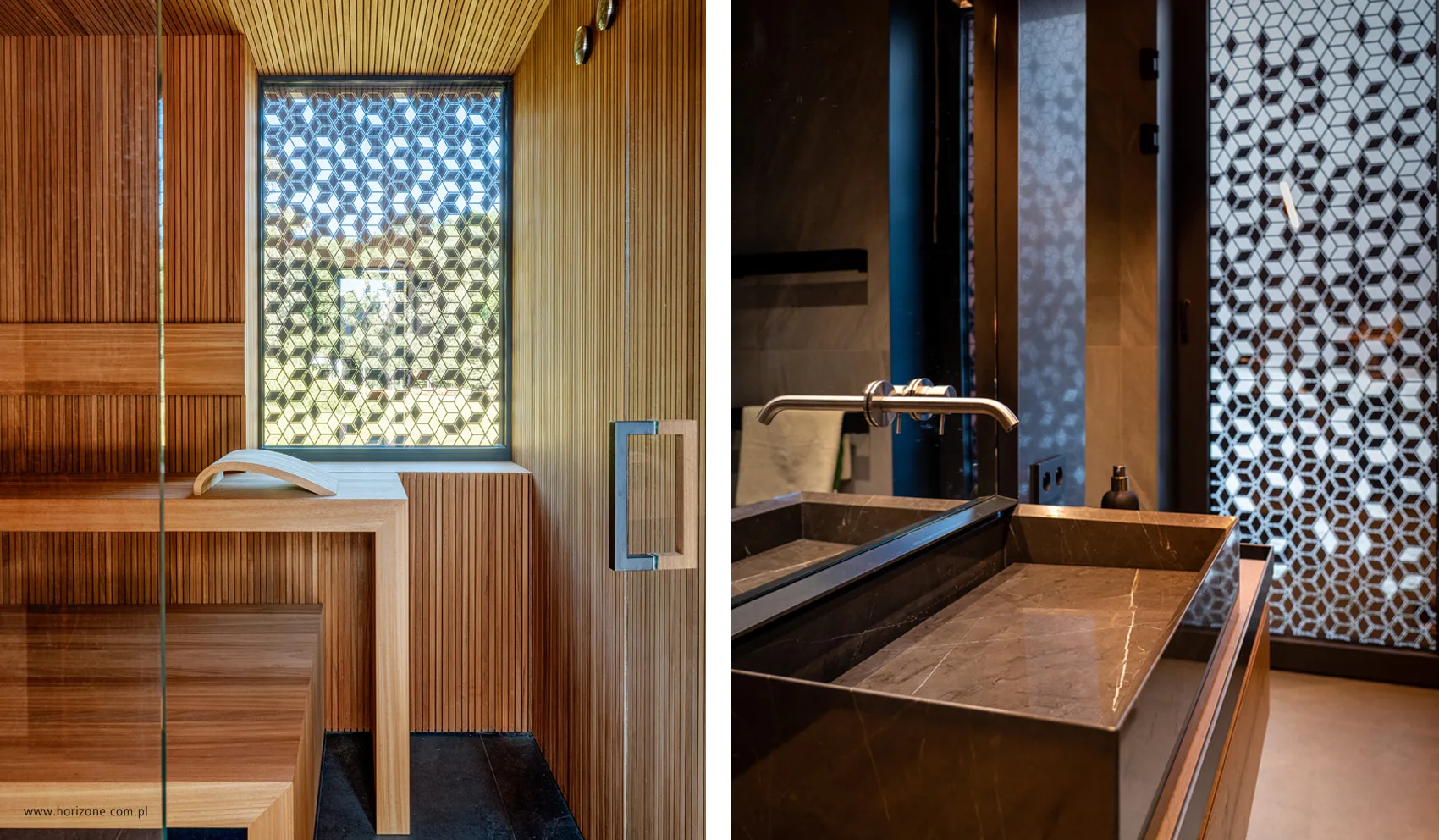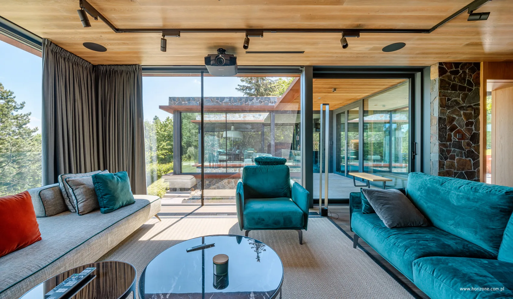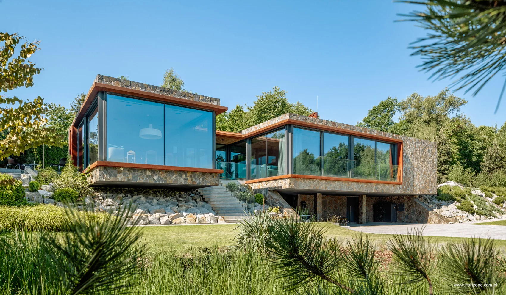 The suburban house was built on a hill on a hectare plot with a 10-meter difference in levels. Horizone Studio architects took advantage of this inconvenience by creating an unconventional block with the technical part (laundry, pantry, garages) set in the ground floor. During the design process, the initially planned 120-square-meter holiday home grew to 290 and changed its character to year-round. The structure of the house is hybrid – its lower part is a concrete box, and the upper part is a steel frame filled with ceramic blocks. The northern exposure of the house with distant views from the hill has been almost completely glazed. A mosaic of brownish-orange stone with irregular forms was planted on the facade. It can be found ….. also in the interiors, which were designed by Katarzyna Kuchejda. The architect wanted the style, colors and materials to correspond with the house’s architecture, rooted in modernism. Hence the stone and stone-referenced surfaces – floors and wall coverings – and the contrasting wooden elements – not only the furniture, but also the ceilings in the living room and bedroom. Modern, minimalist furnishings are visually warmed by carpets made of natural fibers or soft velvet upholstery in saturated colors. Instead of traditional walls, the interior is surrounded by huge glass taffes, providing the interior with beautifully changing views.