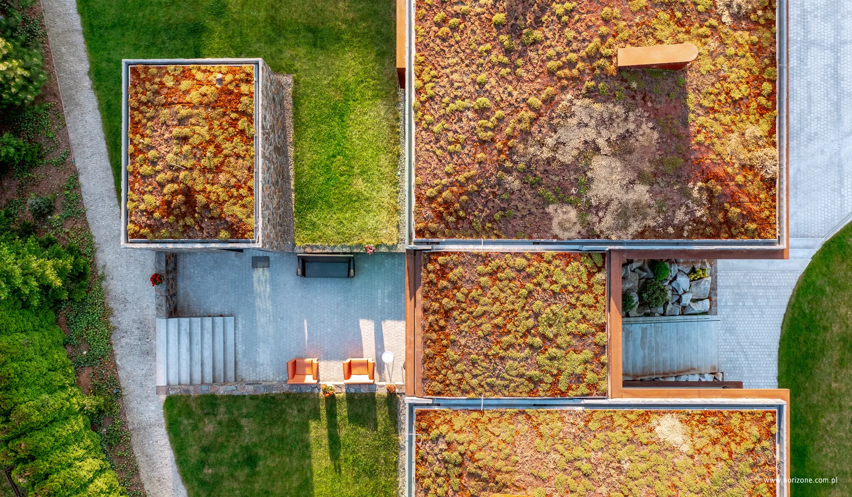 Like a chameleon depending on the season, it changes colors, all thanks to the vegetation planted on it. It protects the roof membrane from both overheating and frost. The vegetation thaws precipitation and evaporates it into the atmosphere – a friendly, ecological, as well as very aesthetic solution. Modern in character, the shutters made of weathering steel have a geometric, openwork pattern with a 3D cube motif, which creates an effective play of light and shadow inside.