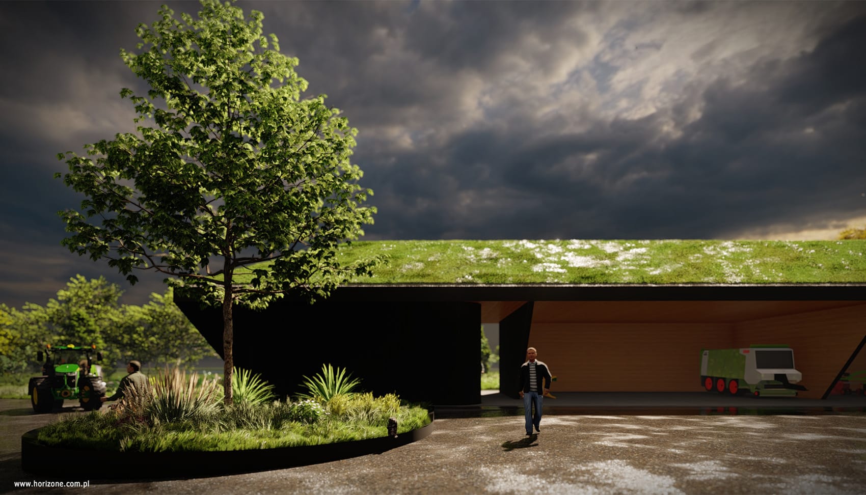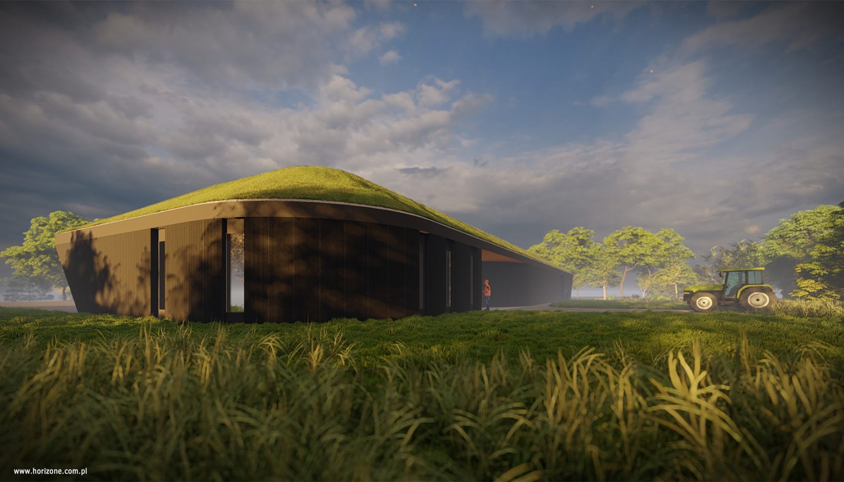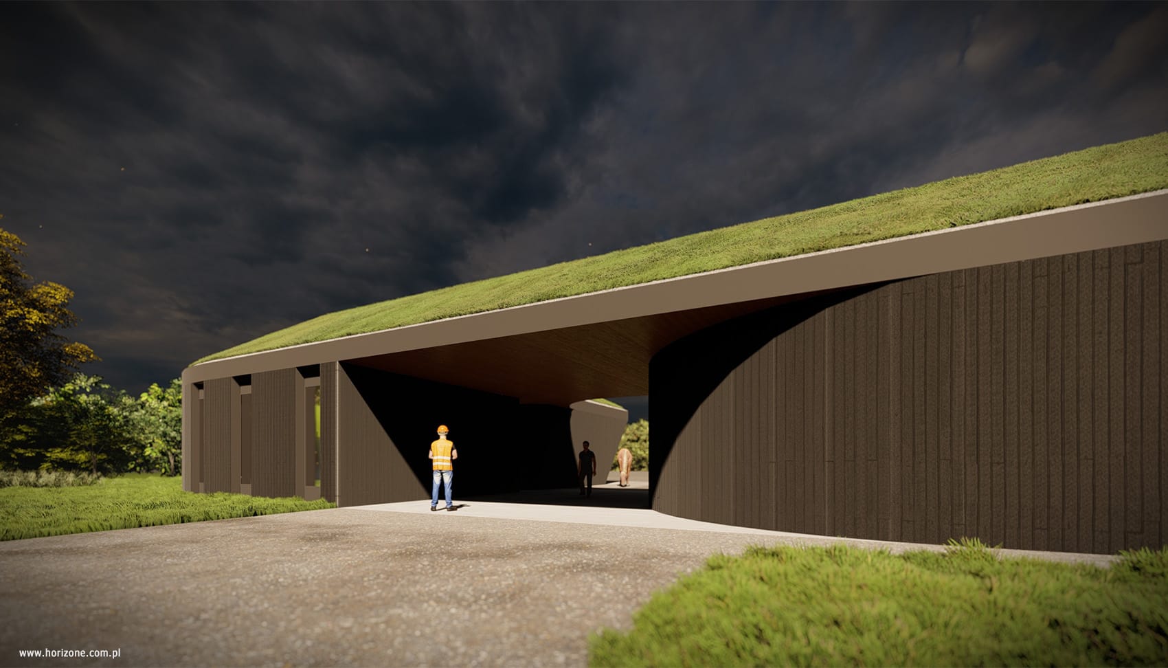 The design of this farm in a town near Krakow was based on detailed guidelines from the investor, including the functional layout of the site, the layout of machinery and additional facilities, and requirements for safety and technical infrastructure. As part of the project, detailed measurements and site visits were conducted to precisely determine the layout of fences, the location of gates, and security zones. A lighting and monitoring system was also designed, with the priority being to minimize energy consumption and reduce light pollution. The centerpiece of the project is a new entrance area with two modular pavilions: a guardhouse with social facilities and a technical facility housing, among other things, a power generator.