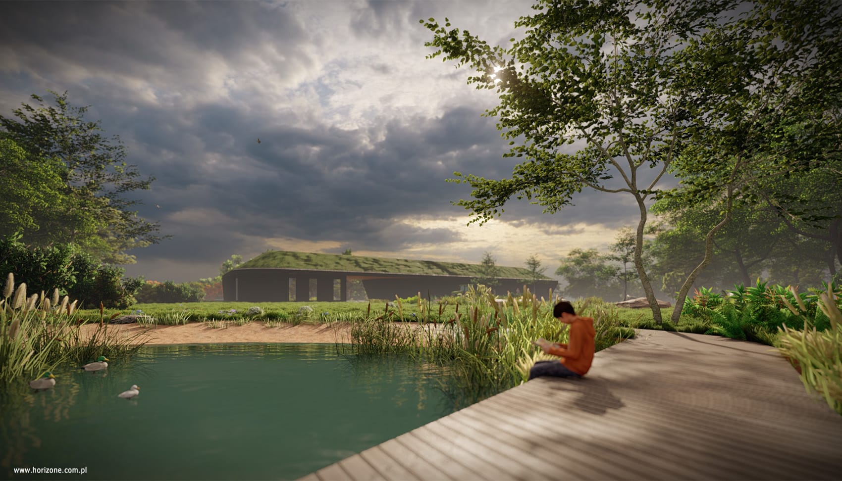 The building’s architecture is based on the principles of minimalism and harmonious integration with the landscape. The horizontal form, with a green roof, a wooden facade made of charred Scandinavian pine panels, and a cross-laminated timber (CLT) structure, emphasizes the modern yet neutral character of the development.