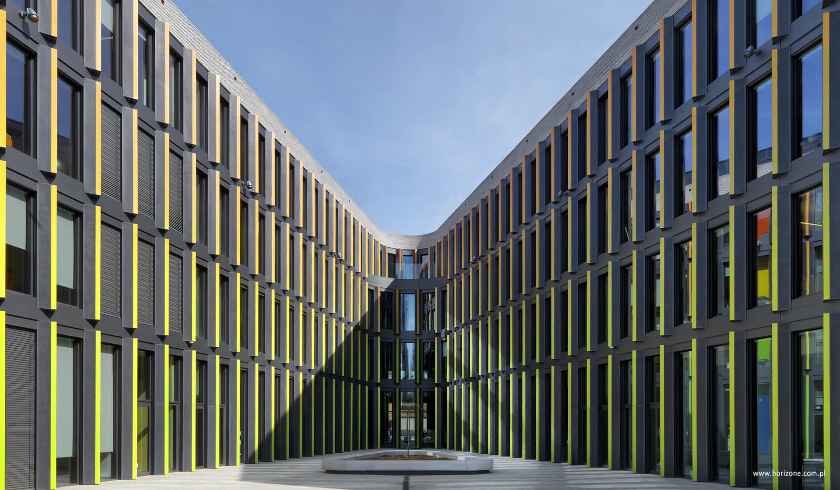 Characteristic colorful vertical blinds on the north and south facing facades refer to the Ericpol logotype. Building’s west courtyard opens up directly to the old park where informal meeting places surrounded by the green landscape will be placed.