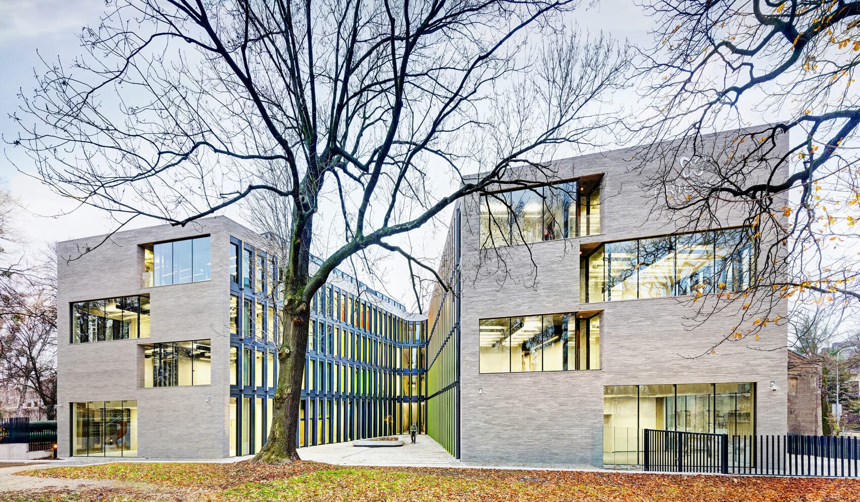The building composes of the two four-story office wings, connected with each other by the glazed lift lobby. The lobby with the centrally located glazed meeting rooms opens itself on each floor to the surrounding green park.