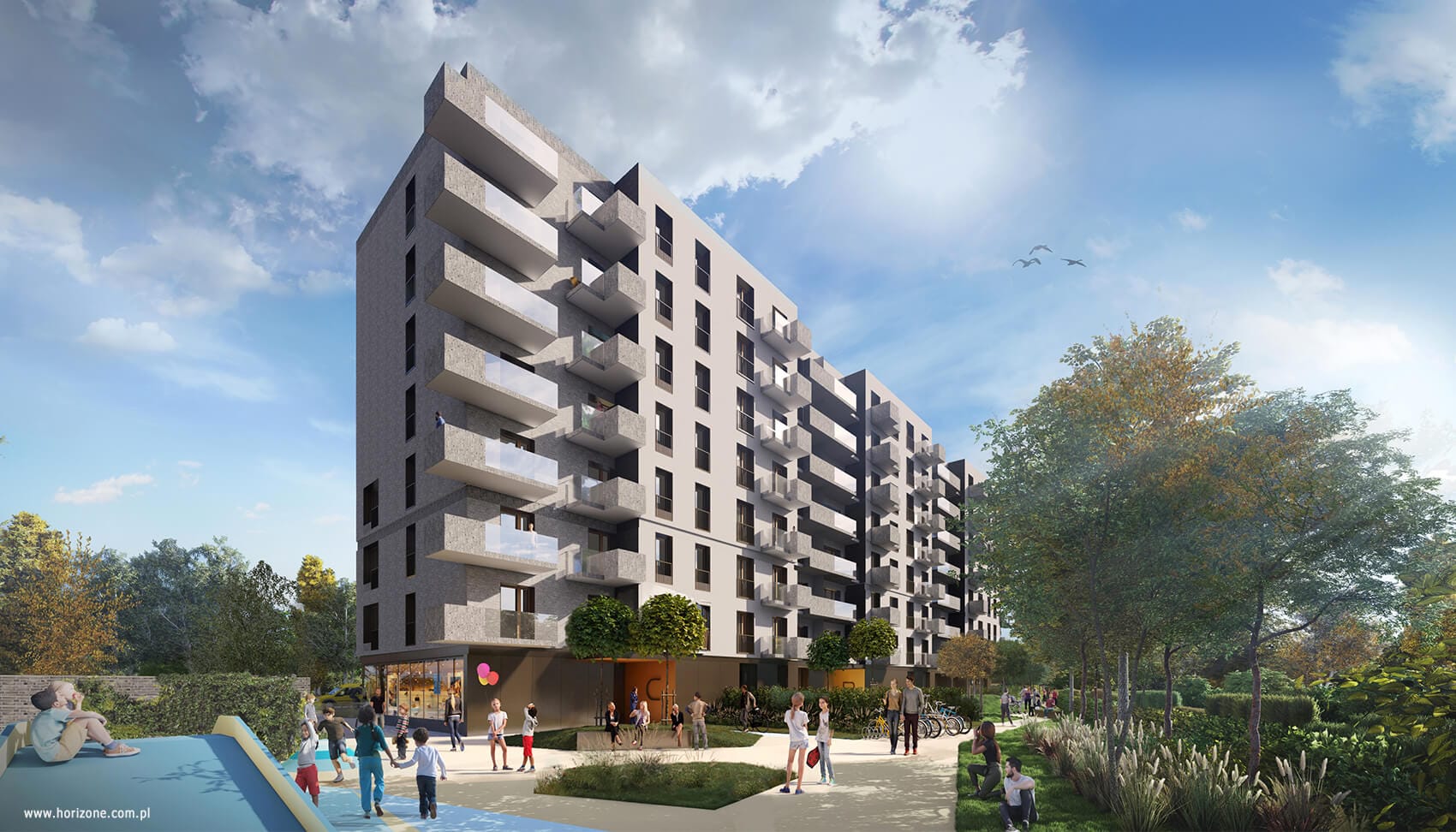On the ground floor, it was planned to locate service premises, with the potential for catering, among others. In the southern part, between the building and the border of the plot, it was planned to create private gardens and a recreational area with a playground.