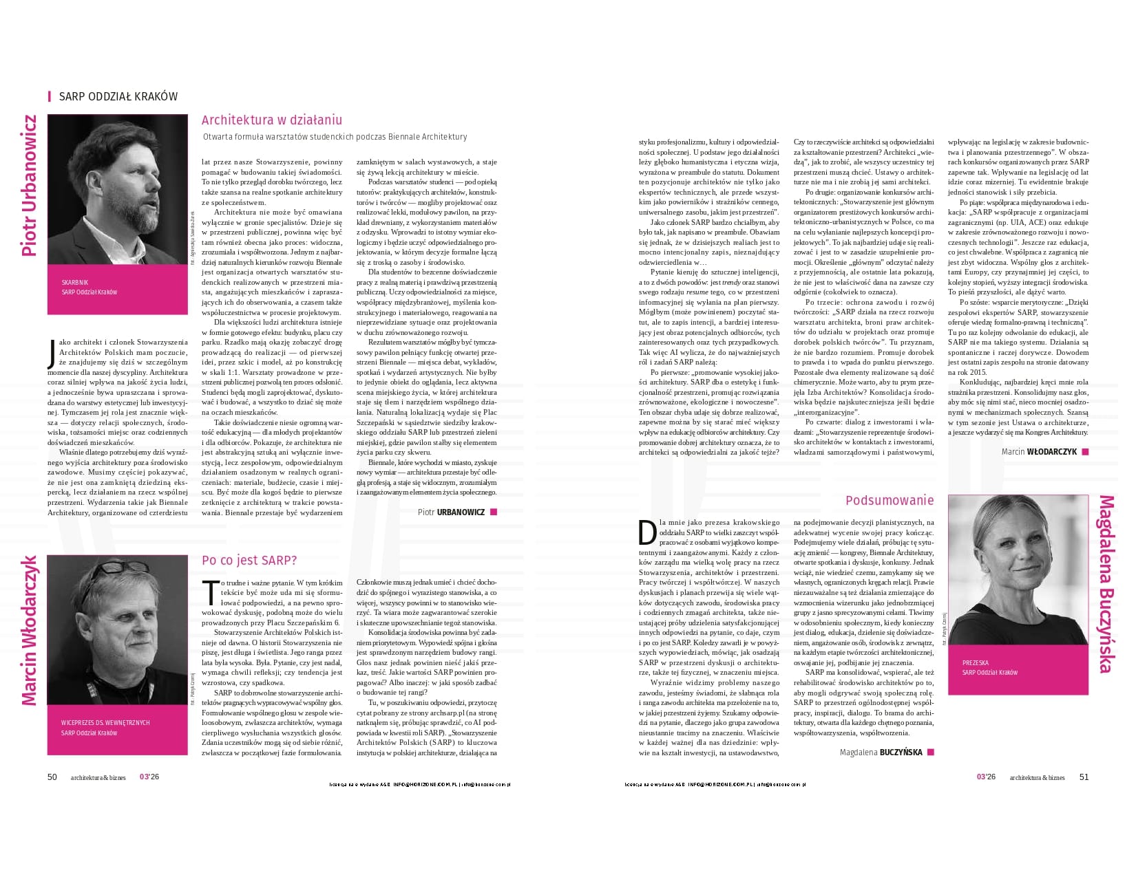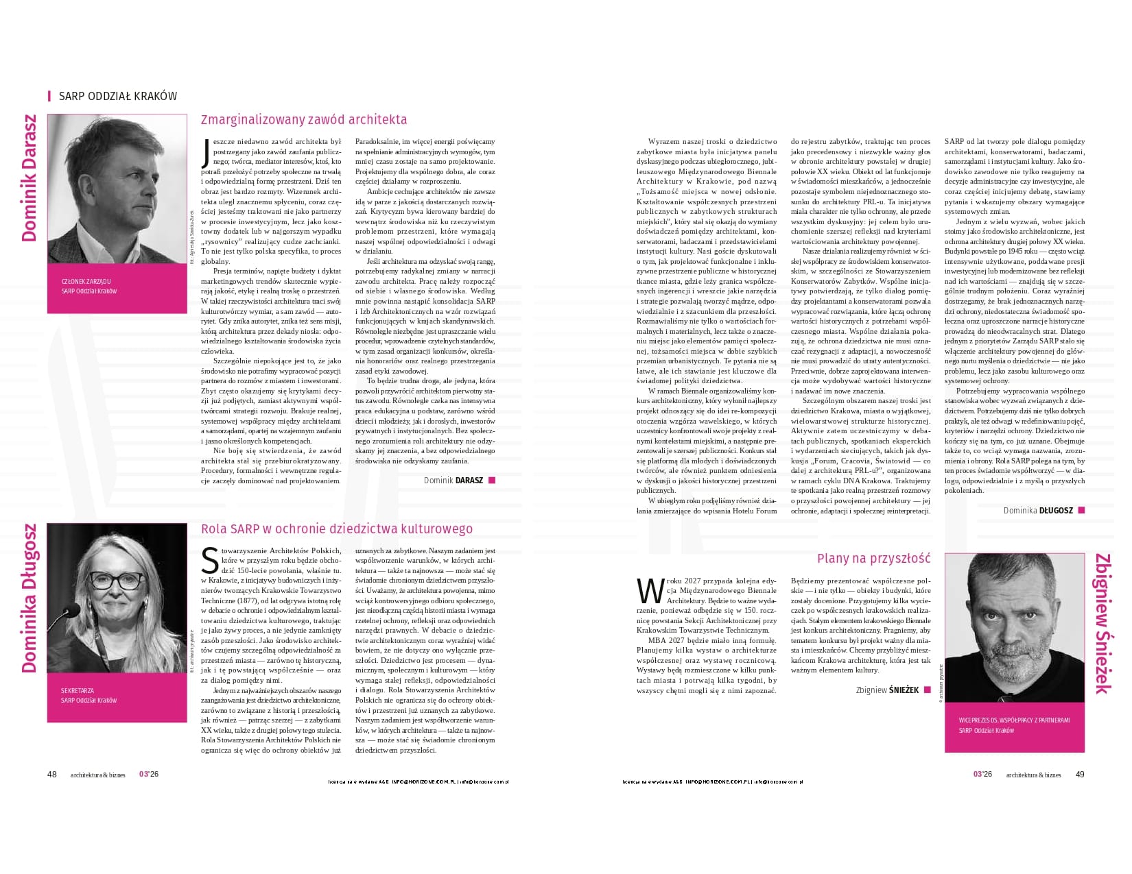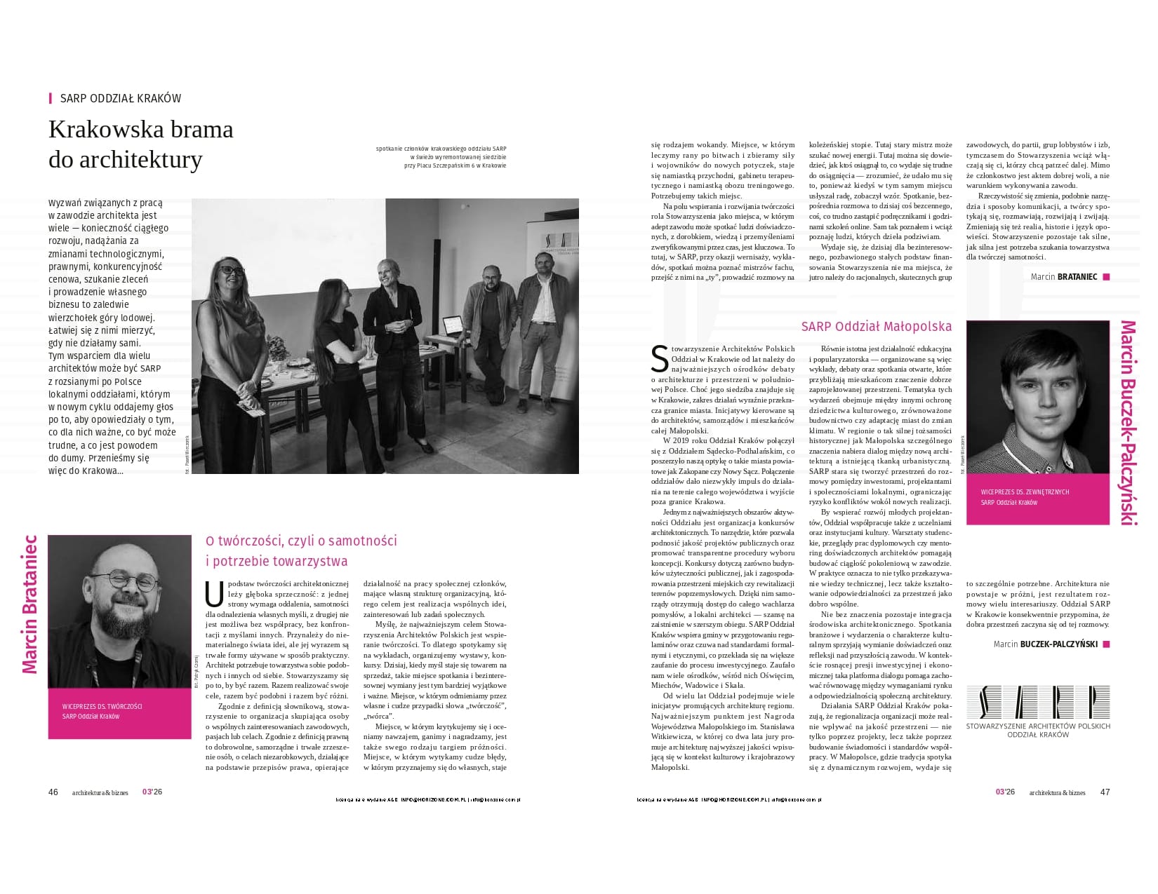 W marcowym wydaniu „Architektura & Biznes” ukazał się materiał poświęcony działalności SARP Oddział Kraków i temu, jak środowisko architektów może realnie wpływać na jakość przestrzeni oraz ochronę dziedzictwa kulturowego. W artykule głos zabierają członkowie Zarządu SARP Oddział Kraków, a wśród nich Dominik Darasz, partner w Horizone Studio, wskazując, jak w ostatnich latach spłycił się wizerunek architekta i jak presja terminów, budżetów oraz trendów marketingowych wypiera jakość, etykę i realną troskę o przestrzeń. W swojej wypowiedzi podkreśla potrzebę odzyskania pozycji partnera do rozmów z miastem i inwestorami oraz konieczność uproszczenia procedur, wprowadzenia czytelnych standardów i wzmocnienia edukacji o architekturze. To ważny, mocny komentarz o tym, dlaczego architektura powinna wrócić do swojej podstawowej misji: odpowiedzialnego kształtowania środowiska życia człowieka.