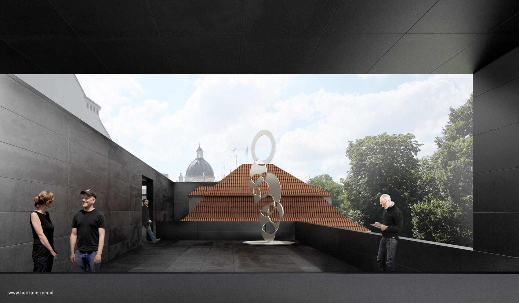 Idea nadbudowy polega na nałożeniu na istniejącą bryłę nowego elementu – obiektu kubaturowego zintegrowanego z tarasem zewnętrznym. Taras od strony sąsiednich kamienic otrzymał jedną ścianę, będącą tłem dla ekspozycji oraz oddzielającą go przestrzennie od zabudowy sąsiedniej. Wszystkie elementy wprowadzone na dach stanowią optycznie jedność – spojone zostaną przez ten sam materiał, w takim samym kolorze. Zarówno ściany, jak i posadzka, balustrady i inne elementy zewnętrze zaprojektowano jako wykończone matowymi, czarnymi panelami.
