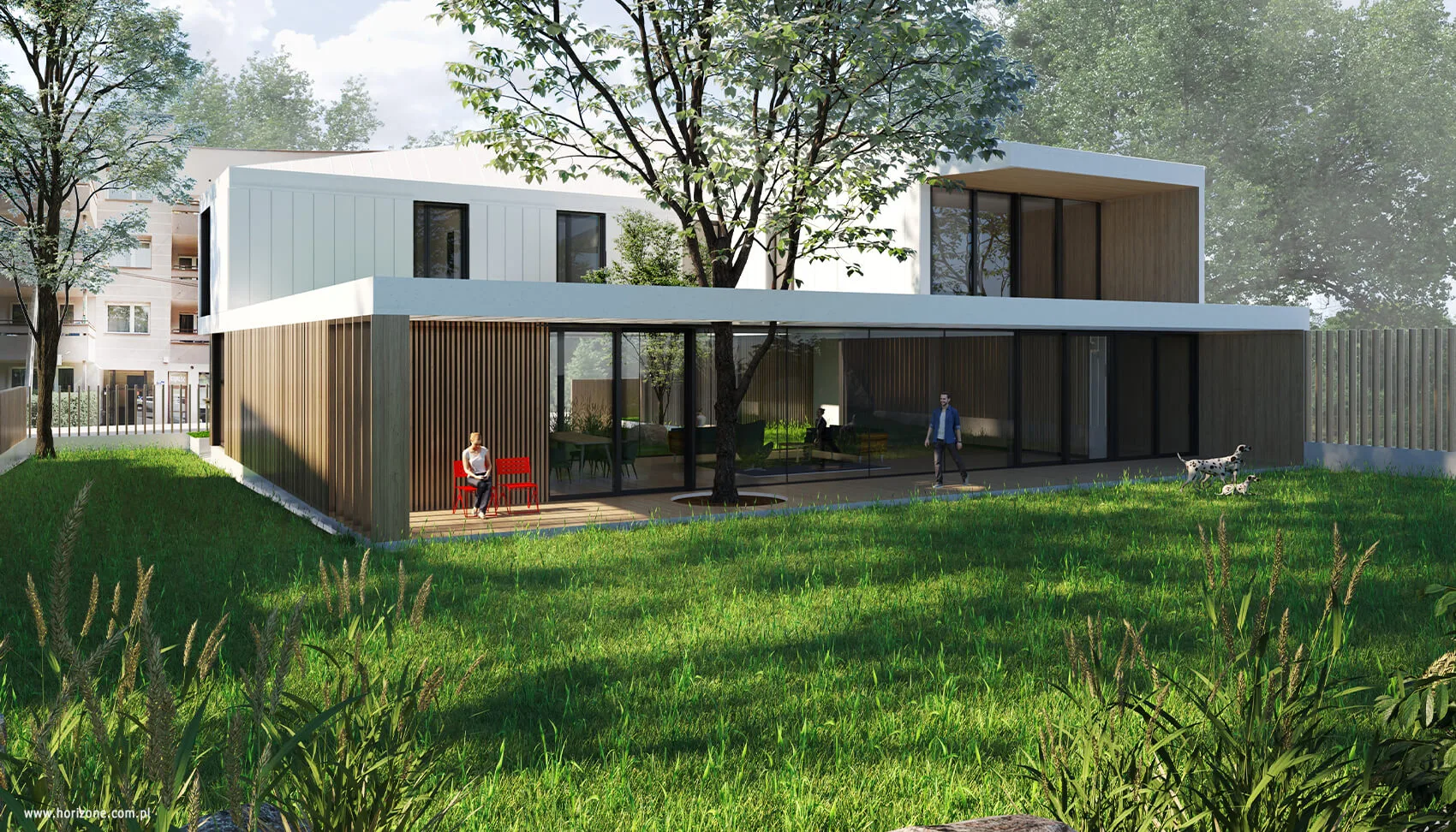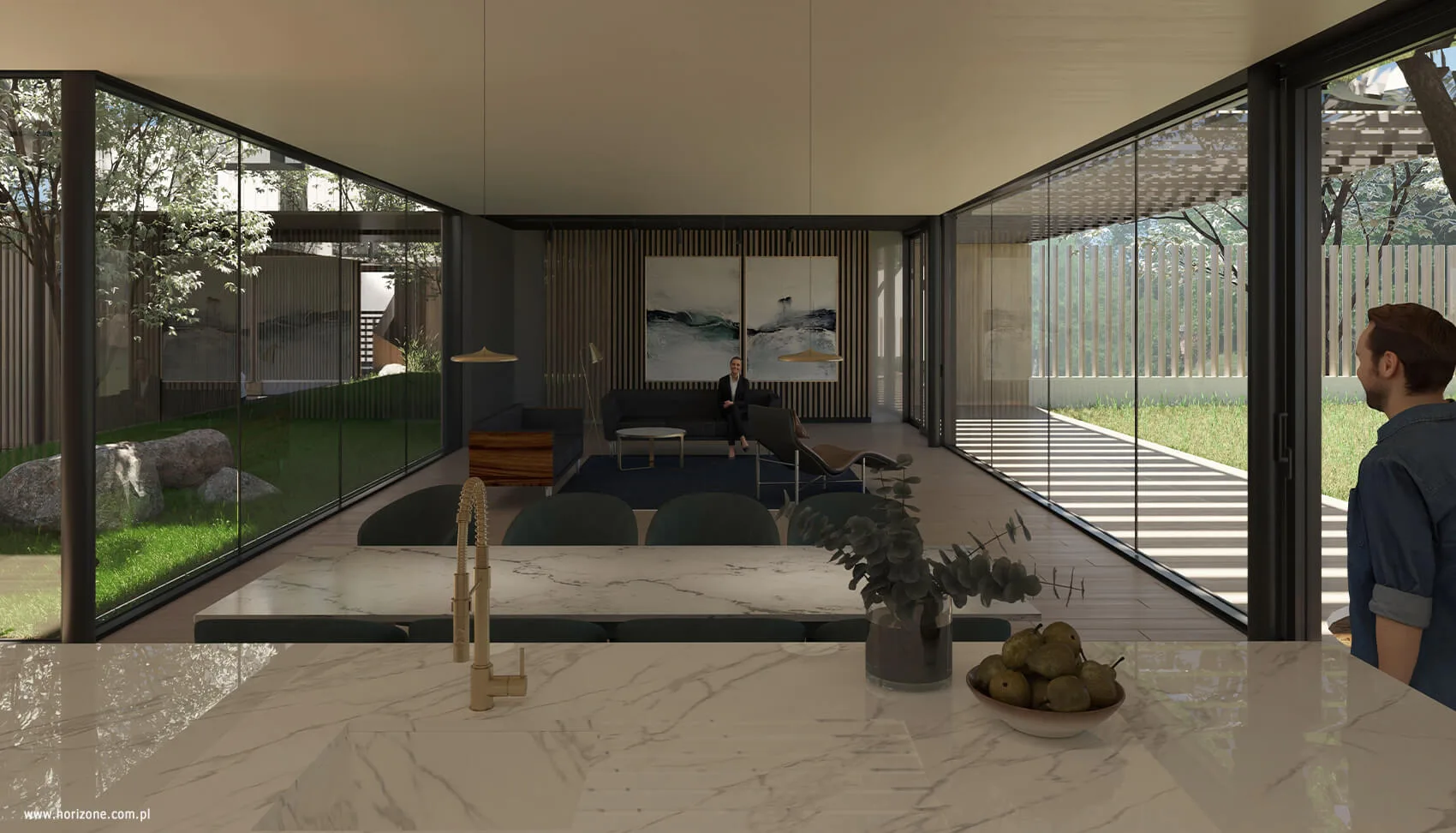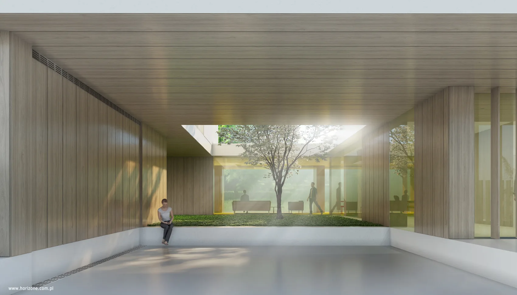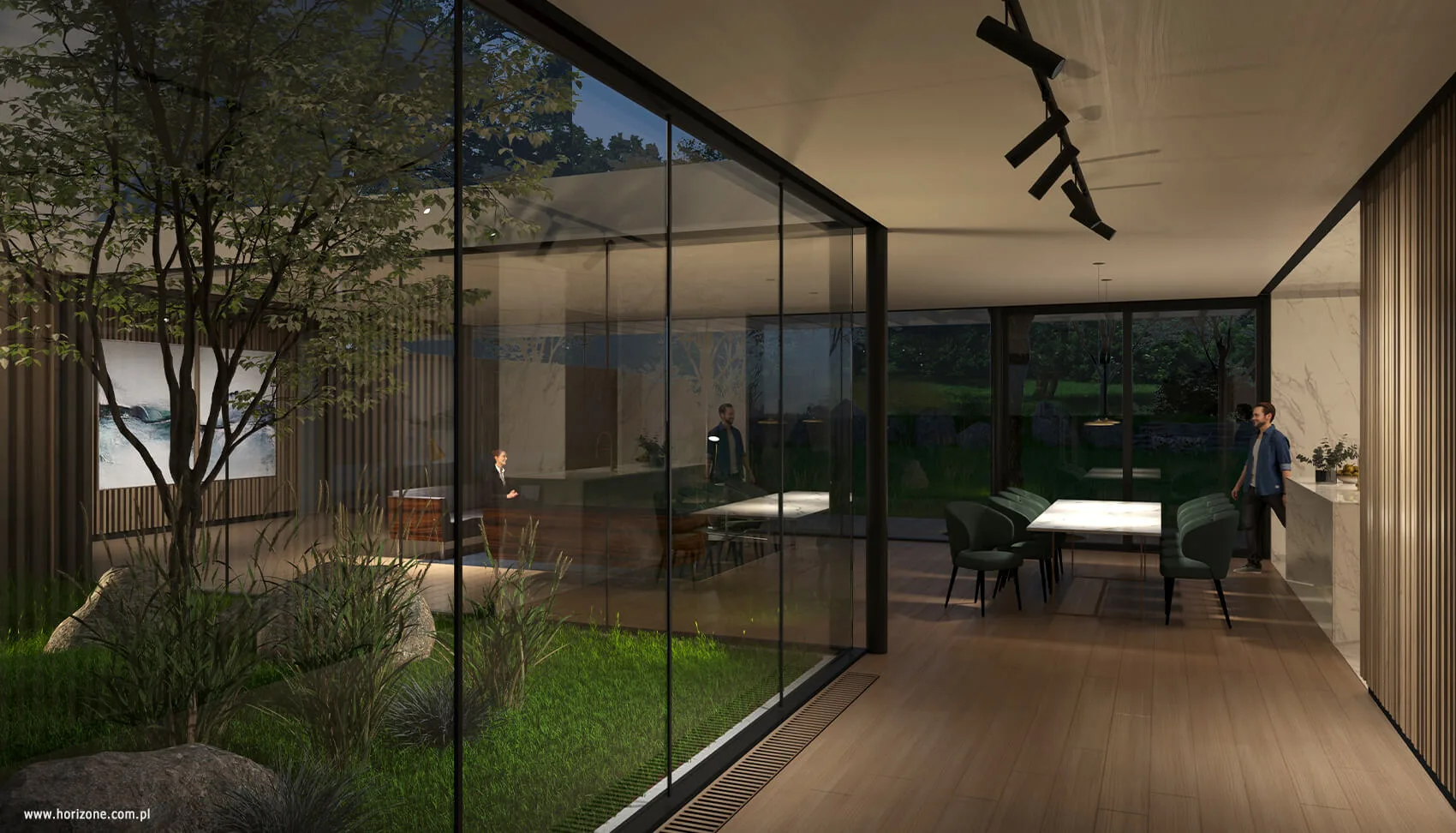 Sercem domu jest atrium z dekoracyjnym drzewem i ogrodem w stylu japońskim, przestrzeń porządkująca układ wnętrz i stanowiąca centralny punkt, wokół którego toczy się codzienne życie domowników. Parter mieści strefę dzienną, a piętro strefę nocną. Układ wnętrz oraz rozmieszczenie okien zapewniają mieszkańcom poczucie prywatności, jednocześnie utrzymując bliski kontakt z otaczającą zielenią.