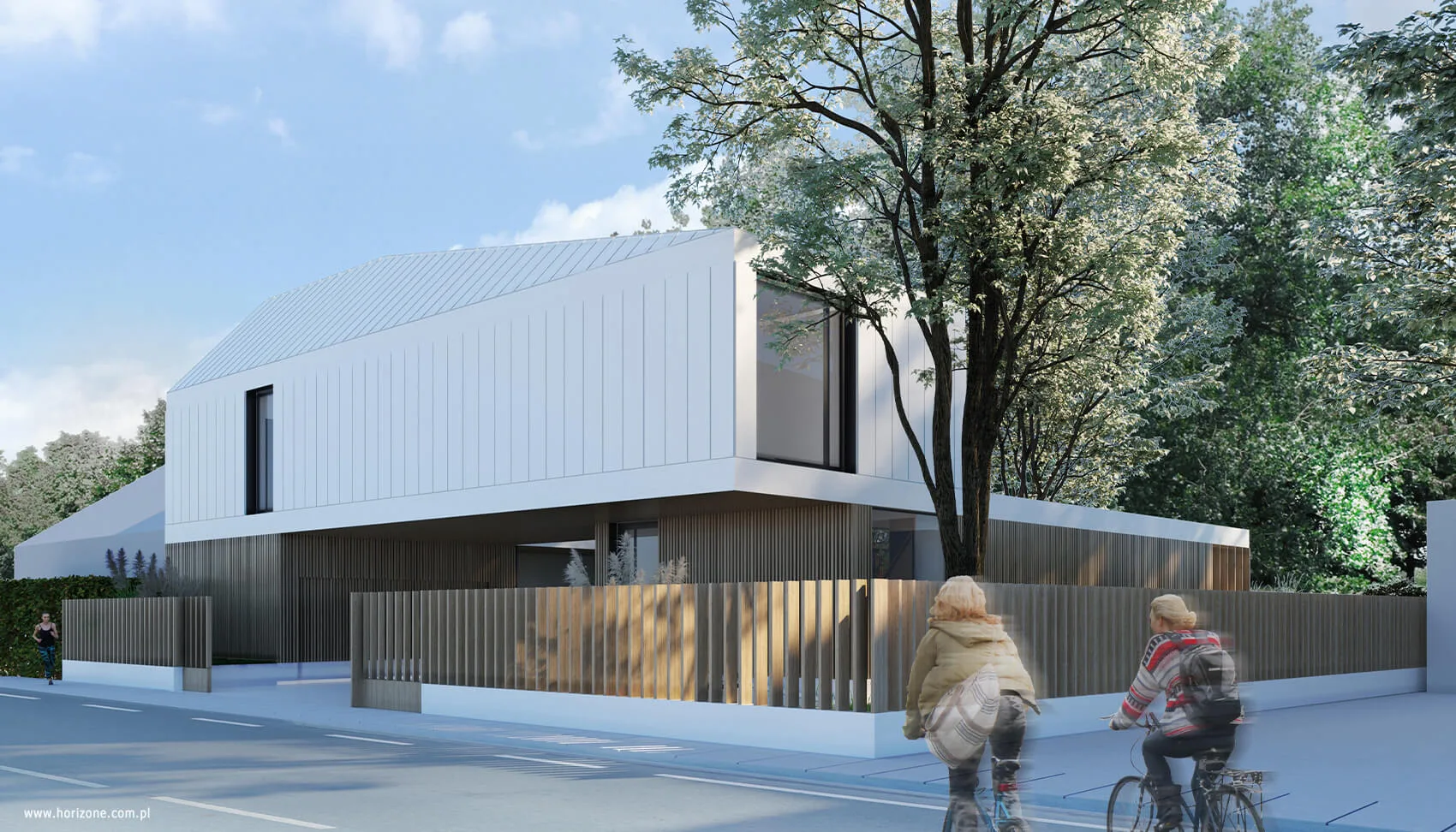 „Dwa Światy” to współczesny dom jednorodzinny, którego architektura opiera się na harmonii kontrastów. Projekt tworzą dwie wyraźnie zróżnicowane bryły, ciepły, drewniany parter oraz lekkie, jasne piętro z paneli aluminiowych. Ich zestawienie odwołuje się do idei yin-yang, podkreślając zarówno podział funkcjonalny budynku, jak i relację pomiędzy strefą otwartą i zamkniętą. Nadwieszona geometria piętra tworzy zadaszoną strefę wejściową i wydziela kameralny dziedziniec. Duże przeszklenia parteru otwierają wnętrze na ogród, pozwalając na swobodne przenikanie światła i natury.