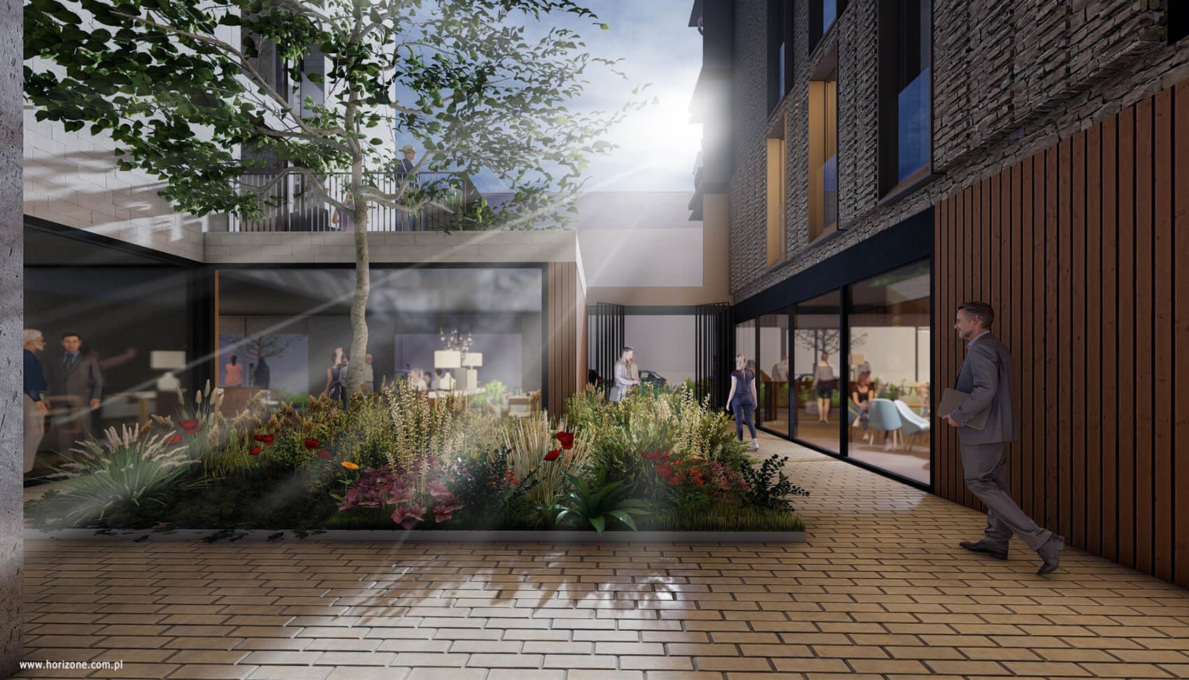 Projekt uwzględnia również przestrzenie wspólne, takie jak kameralne podwórka zapewniające mieszkańcom prywatność.