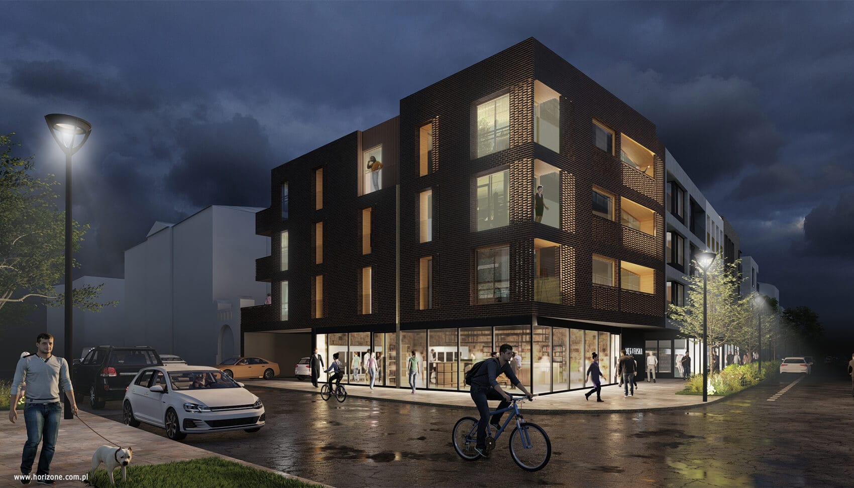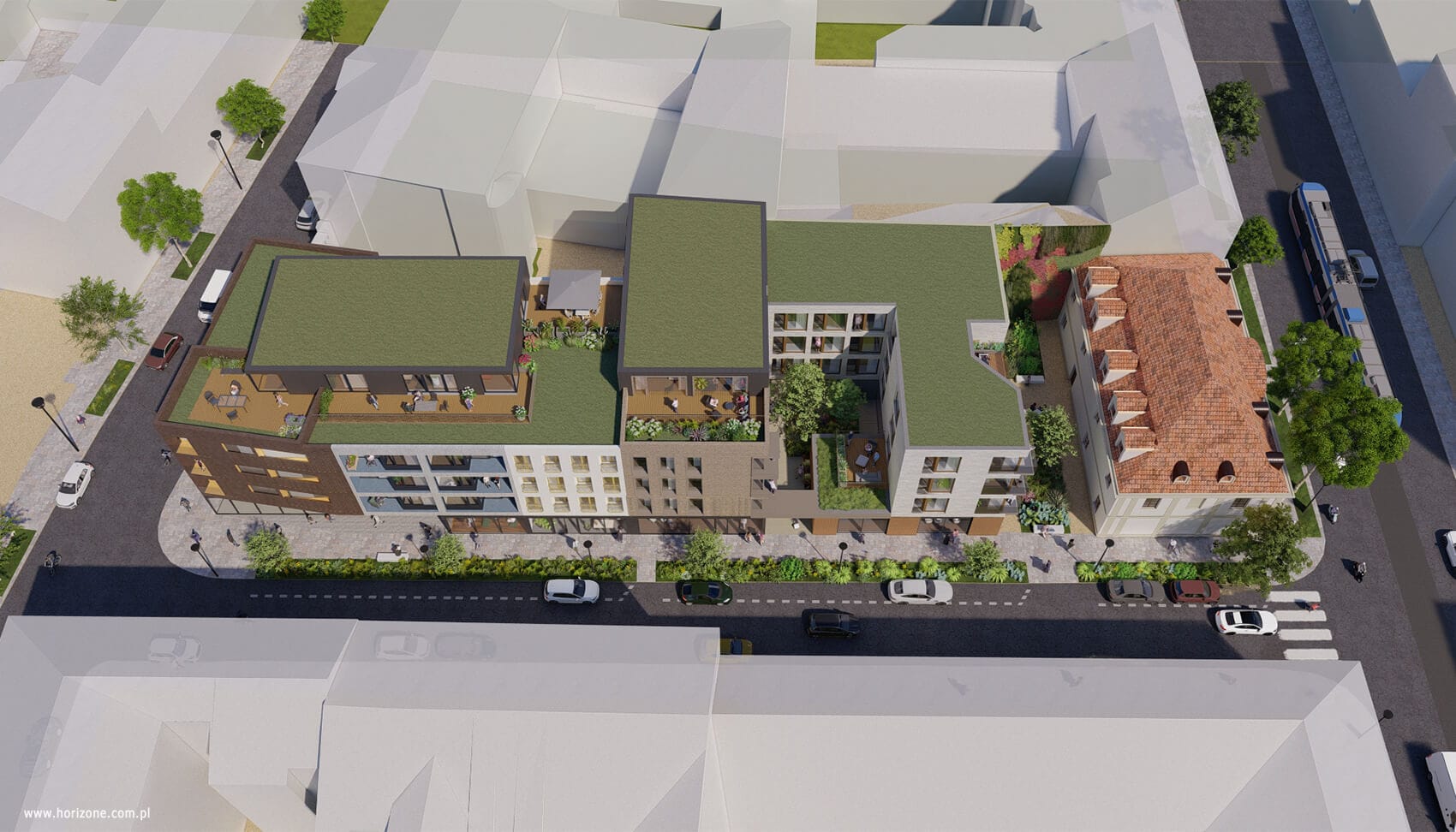 Projekt nie pomija wartościowych wizualnie i historycznie budynków sąsiednich – budynki zostały ukształtowane w taki sposób, aby nie zasłaniać widoków na zabytkowe obiekty, lecz je podkreślać. Kolor i różnorodność materiału eliminuje monotonię i wzbogaca estetykę.